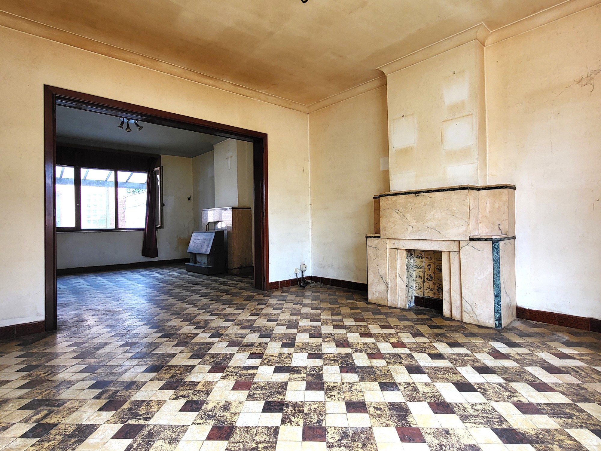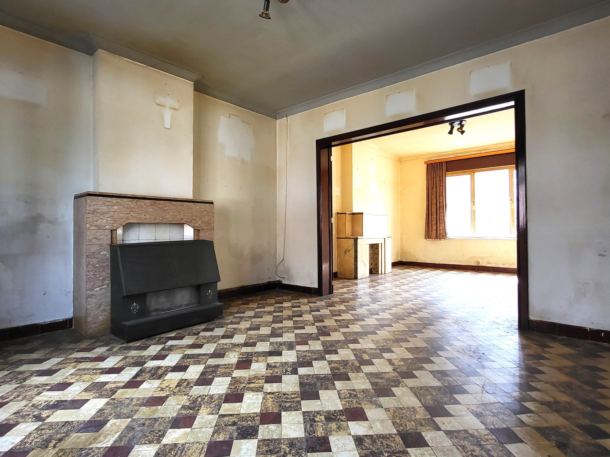 | Omschrijvingliving: 2 schouwen in natuursteen, 1 kachel, authentieke vloeren |